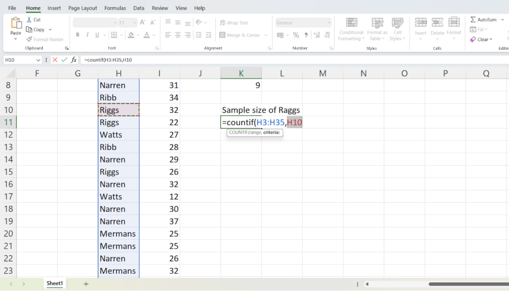 The “countif” function will extract the data according to the range of your provided criteria. This will reduce your range of the sample and assist you in functioning on a smaller range for deeper analysis. To calculate the sample size of the “Riggs” in the above table, apply this formula: